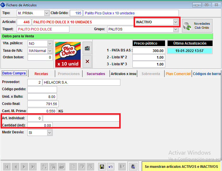 Es importante que revise el stock del Artículo 195 (Cajas x10 Unidades de Palitos Pico Dulce), en caso de no contar con stock disponible deberá desactivarlo y desvincular el articulo individual, como se muestra en el ejemplo a continuación: