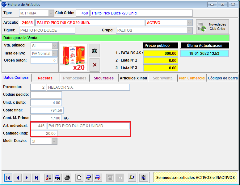 Paso 1: CARGA DEL ARTÍCULO PALITO PICO DULCE CAJA x20 y VINCULACIÓN CON ARTÍCULO INDIVIDUAL